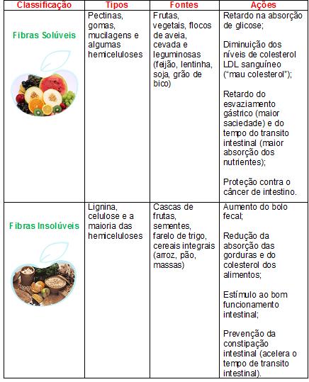 As fibras alimentares compõem-se fundamentalmente de duas categoris , tecnicamente classificadas como :Existem varios tipos de fibras e elas são separadas em duas classes , conforme a solubilidade em água :